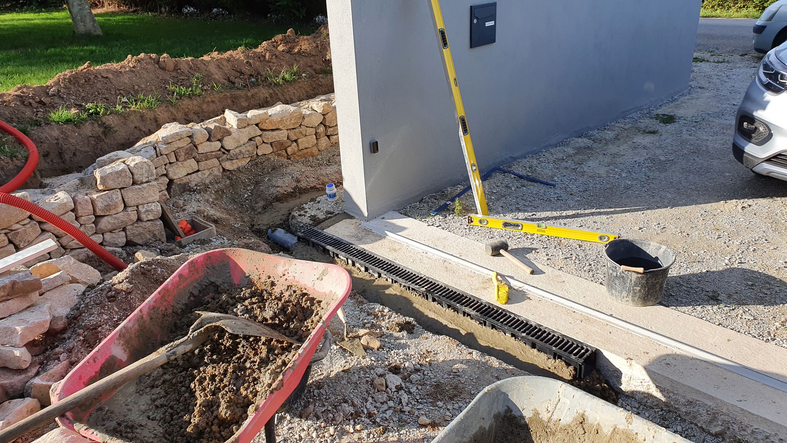 Avec précision, nous avons commencé la découpe du béton. Le but étant pour notre équipe, la mise en place d’un caniveau pour évacuer l’eau pluviale.
